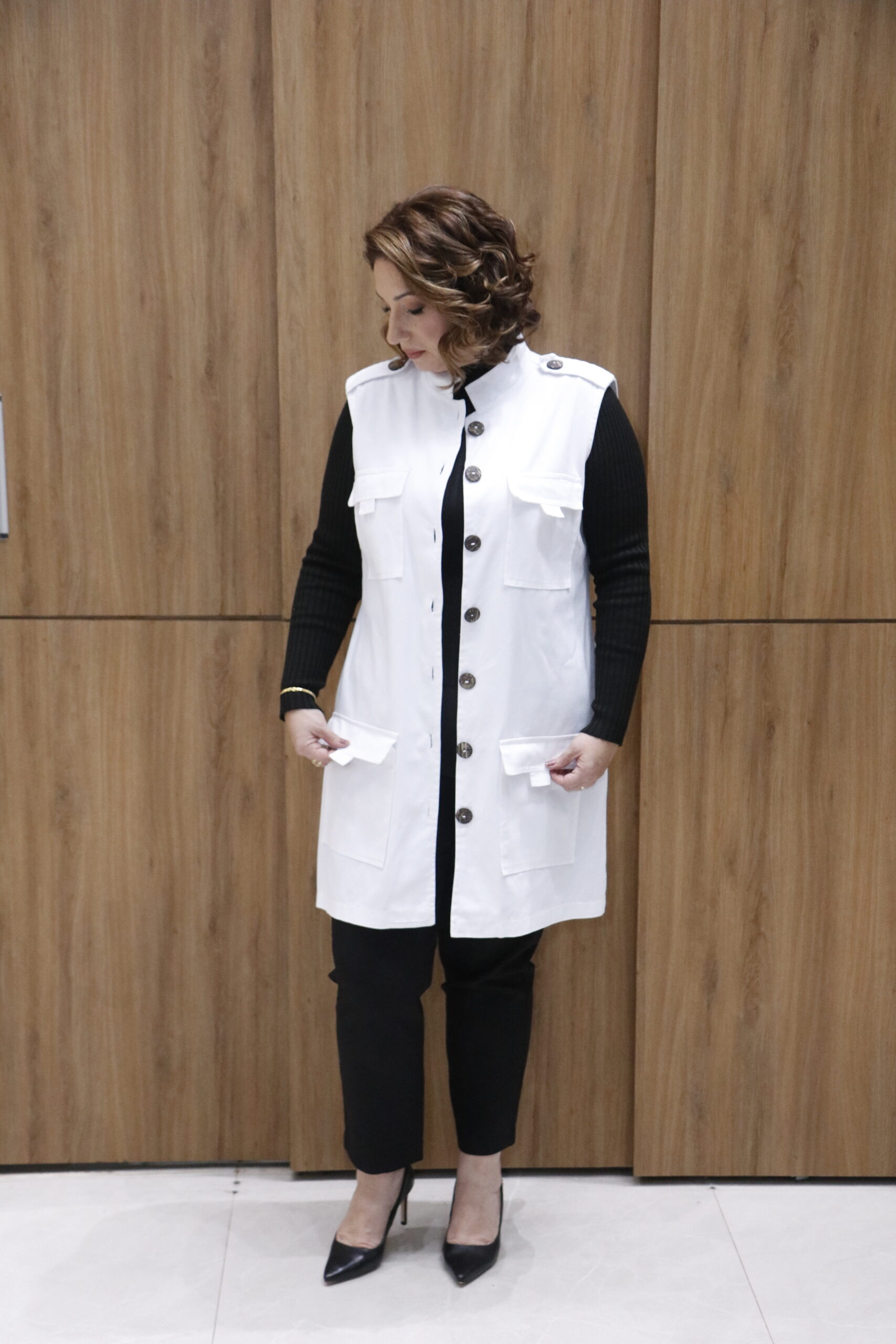 Jaleco Marta é atemporal, um colete longo. Os bolsos frontais, botões encapados e as aberturas laterais dão a ele um ar de terceira peça.