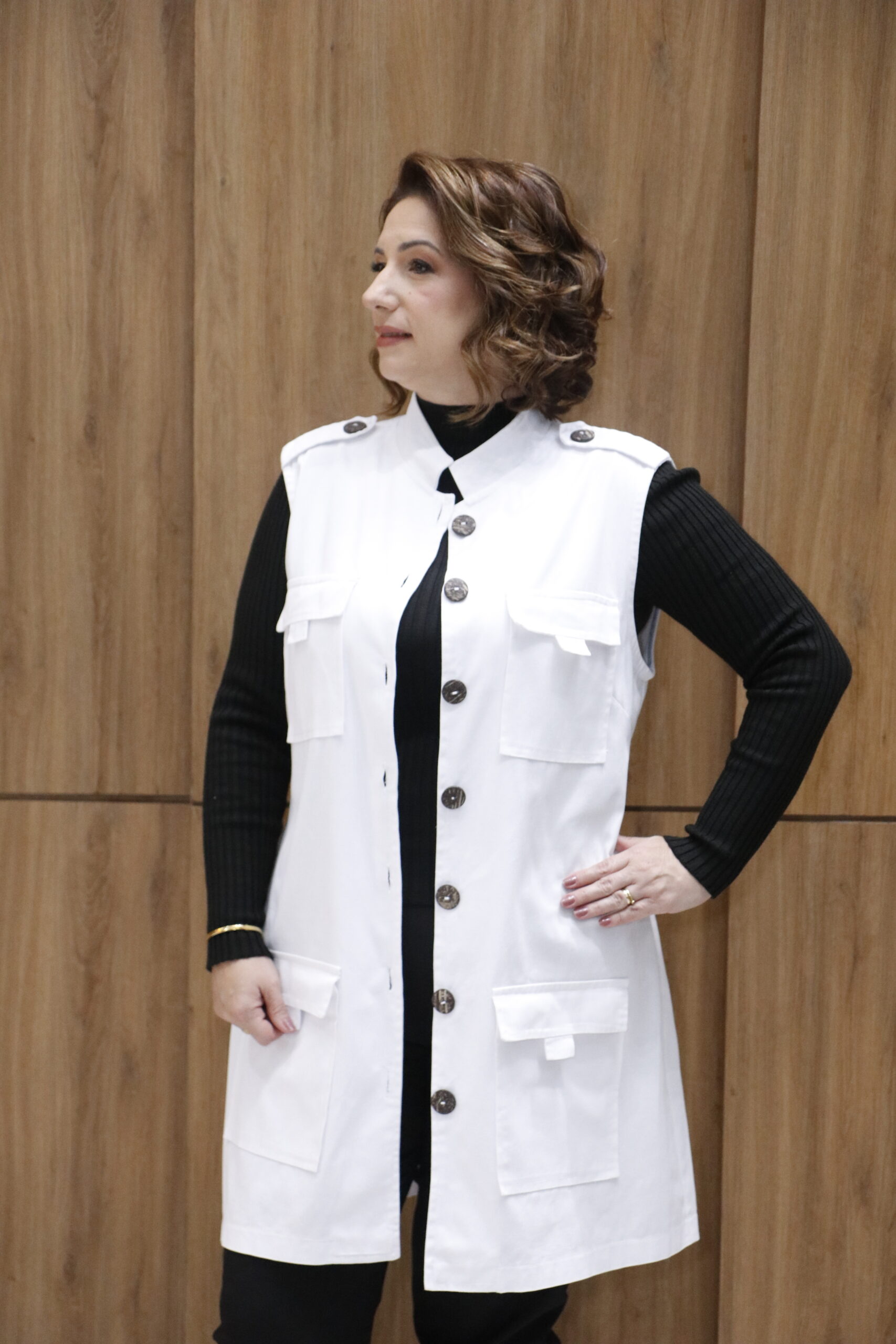 Jaleco Alzira é moderno, um colete cargo. Os bolsos frontais e botões amadeirados dão a ele um ar de dinamismo.