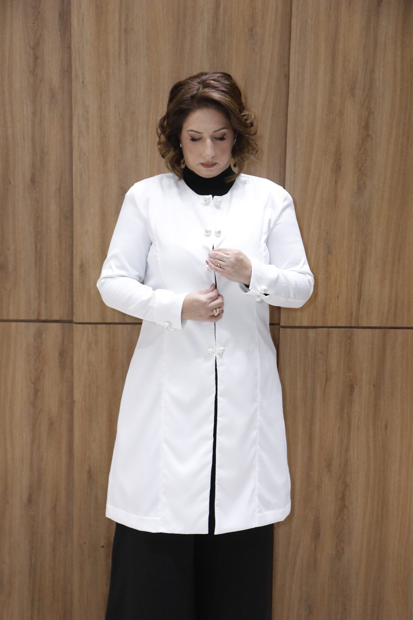 O Jaleco representa as qualidades de uma mulher forte e romântica ao mesmo tempo; transmitindo uma elegância ímpar a quem usa.